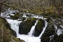 The small stream at the top of Wrynose quickly gathers pace as it descends some 930 feet (283 m) in a distance of about two miles (3.2 km), running roughly parallel to, and south of, the Wrynose Pass road. Before flowing into Little Langdale Tarn it subsumes Bleamoss Beck, the outflow from Blea Tarn. Little Langdale Tarn is also replenished by the Greenburn Beck. The Brathay drains Little Langdale Tarn at its eastern side. It continues in an easterly direction, over Colwith Force where it falls 40 feet (12 m), before turning north and flowing into the tarn of Elter Water at an elevation of 187 feet (57 m) above sea level. Elter Water is also replenished by the Great Langdale Beck.[2]