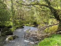 The Afon Prysor is the largest tributary of the Dwyryd, entering its left bank in the tidal section downstream of Maentwrog. It rises in the hills to the east of Trawsfynydd and flows past the southern end of the village to enter Llyn Trawsfynydd, a large reservoir close to the A470. Prior to construction of the dam in the 1920s for hydroelectric power, the river had wandered across a broad upland marsh here known as Cors Goch.[1] It is the only inland water in the UK that has been used as a source of cooling water for a nuclear power station. The Afon Prysor resumes its course below the dam, to flow down to the Dwyryd through the steeply wooded valley of Ceunant Llennyrch which is at the core of a national nature reserve. Most of the flow from the reservoir is channelled through the hydro-electric power station close to Maentwrog; the flow then re-joins the Prysor just before the confluence.