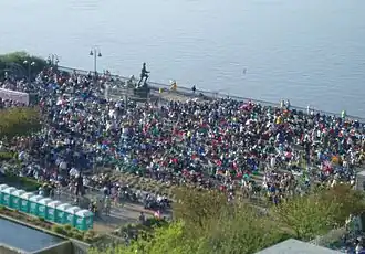 Riverfront Plaza/Belvedere is a public area on the Ohio River in Downtown Louisville, Kentucky. Although proposed as early as 1930, the project did not get off the ground until $13.5 million in funding was secured in 1969 to revitalize the downtown area (through which Interstate 64 had just been built). On April 27, 1973, the Riverfront Plaza/Belvedere was dedicated. Running between Third and Sixth streets, it consisted of a large parking garage and the interstate, and a grassy 7-acre (28,000 m2) park built atop. The grassy park section on the western end was the Belvedere, and the Riverfront Plaza to the east included other attractions: fountains, shelters and an ice-skating rink, as well as buildings such as the Galt House, One Riverfront Plaza and the American Life Building.