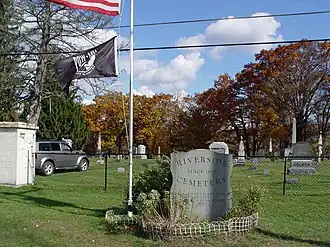 Riverside Cemetery is a historic cemetery located near Apalachin in Tioga County, New York. It was established in 1802, with late-19th century additions and an addition in 1939. It remains an active burial ground containing approximately 3,600 burials. It is the final resting place of many early settlers of the region. A set of stone entrance gates were installed in 1939. Notable burials include May Louise Davison Purple (1871-1957), wife of author Eugene Manlove Rhodes.[2]