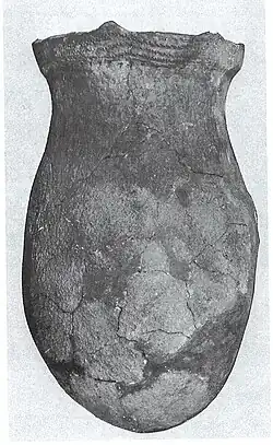53 vessels of Wayne ward were recovered. Wayne ward is characterized by globular to slightly elongated vessels with constricted neck and outflared rims; grit-tempered with fine to medium grains; rims are plain and rarely decorated; and almost never castellated or collared. Surface finish is generally cordmarked. This type is similar to the "generalized woodland" or generic grit-tempered cordmarked vessels typical of the transition from Middle Woodland to Late Woodland.[1][6]