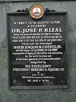The City Government of Calamba, through the leadership of then Mayor Joaquin Chipeco started the idea of building the tallest Rizal monument as a gift of the people of Calamba as a tribute to its greatest son. He realized that it is proper and fitting to have the tallest monument in honor of Rizal in his hometown. Together with the local government unit of Calamba, the Philippine Amusement and Gaming Corporation (PAGCOR) initially funded the construction of the Rizal Monument. A young sculptor Jonas F. Roces from Marikina was commissioned to build the Rizal monument in December 2010. The original plan was to build a 16.4 feet monument. However, then Mayor Chipeco learned that the monument being sculpted is behind the current tallest Rizal monument in Nueva Vizcaya built by a Jordanian national.[4] Three months before the official unveiling, the Rizal@150 Executive Committee increased the height of the monument to 22 feet.[1] It was officially unveiled by President Benigno Aquino III on June 19, 2011, on the sesquicentennial birth anniversary of Rizal. It consists of two markers from the National Historical Commission of the Philippines and from the City Government of Calamba.