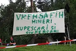 The Roșia Montană campaign was originally organized by locals of Roșia Montană who refused to be relocated and battled the corporation for years in the courts.[20] The activists claimed that the project would cause an environmental disaster, that it would destroy the ancient Roman archeological sites[19] and that the project involved handing assets to the Canadian company, while the Romanian state would earn only 6% out of the project.[23][24]