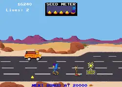 The player controls Road Runner, who is chased by Wile E. Coyote. In order to escape, Road Runner runs endlessly to the left. While avoiding Wile E. Coyote, the player must pick up bird seeds on the street, avoid obstacles like cars, and get through mazes. Most of the time Wile E. Coyote will just run after the Road Runner, but he occasionally uses tools like rockets, roller skates, and pogo sticks.