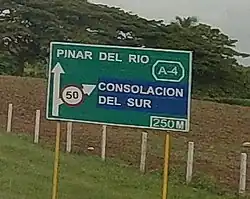 Highway signs in Cuba generally use green for the four main motorways (the A1, A2, A3, A4, and their spur routes), and blue for state highways and motorways outside the major 4 (the I–3 and the Carretera Panamericana).