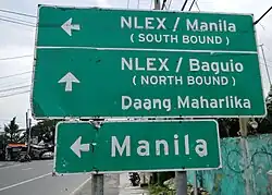 Road signs in the Philippines are regulated and standardized by the Department of Public Works and Highways (DPWH).[1][2] Most of the signs reflect minor influences from American and Australian signs but keep a design closer to the Vienna Convention on Road Signs and Signals, to which the Philippines is an original signatory.[3][4] The Philippines signed the convention on November 8, 1968, and ratified it on December 27, 1973.[5]