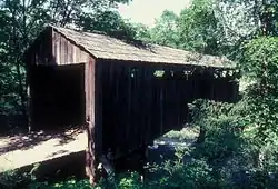 Roaring Camp Bridge, clad with unpainted vertical 1-by-6-inch (2.5 by 15.2 cm) boards, had ribbon openings along its side walls.[3] The Howe truss bridge, 88 feet (27 m) long, was demolished in 1995.[2] Added to the National Register of Historic Places in 1979, it was delisted after its demolition.[1]