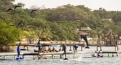 It is part of Anthony's Key Resort, a tourist complex belonging to the Galindo family, that offers accommodations in bungalows, kayaking, spas, excursions and various interactions with captive dolphins such as swimming.[2] It was founded in 1989 with the purpose of investigating coral reefs and aquatic life in general in the coastal zones of Honduras and the surrounding areas.[3] The institute also has a small marine museum and the "Dolphin Discovery Camp" for the study of dolphin behavior (two when it started) and in 2017 the population of the dolphinarium was twenty-six cetaceans.[4] Of these, seven were captured wild, one was rescued and eighteen were born there.[4] They are spread over two coastal enclosures, one on the small island of Bailey's Key (Dolphin Encounter) and the other on the main island of Roatán (Dolphin Presentation).
