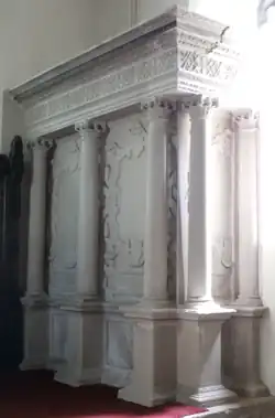 His large monument, with strapwork decoration, survives against the south wall of the chancel of All Saints Church, Clovelly. Along the full length of the cornice is inscribed in gilt capitals: Robertus Carius, Armiger, obiit An(no) Do(mini) 1586[8] ("Robert Cary, Esquire, died in the year of Our Lord 1586"). On the base of the north side are shown two relief sculpted heraldic escutcheons, showing Cary impaling Chequy argent and sable, a fess vairy argent and gules[9] (Fulkeram, for his father) and Cary impaling Sable, three swords pilewise points in base proper pomels and hilts or (Poulett, for his grandfather). On the base of the west side is a similar escutcheon showing his own arms of Cary (of four quarters, 1st: Cary; 2nd: Or, three piles in point azure (Bryan);[10] 3rd: Gules, a fess between three crescents argent (Holleway);[11] 4th: A chevron (unknown, possibly Hankford: Sable, a chevron barry nebuly argent and gules[12]) impaling Gules, a chevron or between three millets hauriant argent (Milliton, canting arms, a "millet" in heraldry being a type of fish, possibly a mullet)[4])