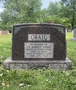 On May 26, 1944, Lt. Craig posthumously received the Medal of Honor for "conspicuous gallantry and intrepidity at the risk of life, above and beyond the call of duty."[16] The medal was presented to Craig’s father, William, by Major General Alan W. Jones at Camp Atterbury-Muscatatuck. In addition to his father, his mother, brother, and sister were also present.[17][18]Lt. Craig’s remains were transported back to Toledo, where he is buried at Toledo Memorial Park with his parents.[19]