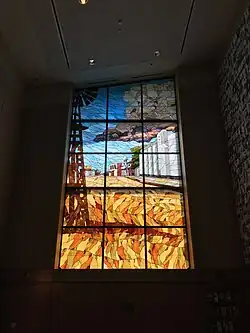 The Darby Gallery is the main lobby of the Dole Institute. It features the Russell Window, the Kansas Granite Floor Map, and the beginning of the museum exhibit. The Darby Gallery is a gift from the family of former Kansas United States Senator Harry Darby.