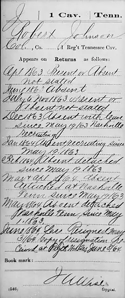 Robert Johnson joined the Union Army at Camp Dennison (near Cincinnati, Ohio), in February 1862 for three years' service,[15] being commissioned Colonel of the 4th Tennessee Volunteer Regiment, which he organized. He nominally commanded said unit, which was eventually mounted and redesignated 1st Tennessee Cavalry Regiment, in the Western theater of the American Civil War.[16]
