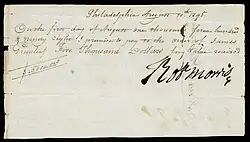 Out of public office for the first time since the start of the American Revolution, Morris focused on expanding his shipping business. He partnered with several out-of-state businessmen, including Jonathan Hudson of Maryland and Carter Braxton and Benjamin Harrison of Virginia, to form what biographer Charles Rappleye calls "the first national conglomerate." In these trading ventures, Morris often provided financing and oversight but left the details to his partners.[68] With national finances in tatters, Morris led a group of merchants in creating the Bank of Pennsylvania, which provided funding for the purchase of supplies by the Continental Army. The bank did not engage in the full range of modern banking activities, but it did accept deposits and provide a potential model for monetary reforms at the national level.[69] The success of the bank provided a boost to Morris's popularity, and in October 1780, he won election to the state legislature.[70]William Bingham, rumored to be the richest man in America after the Revolutionary War,[71] purchased 9.5% of the available shares of the Bank of North America. The greatest share, however, 63.3%, was purchased on behalf of the United States government by Robert Morris, using a gift in the form of a loan from France and a loan from Netherlands.[72] This had the effect of capitalizing the bank with large deposits of gold and silver coin and bills of exchange. He then issued new paper currency backed by this supply.[73]