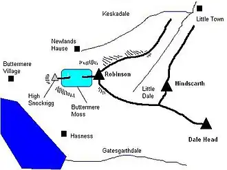 The western flanks of the fell fall to Buttermere, the village itself standing on Robinson's territory. The top and bottom sections are quite steep but the slope levels out at 1,500 feet (460 m) to accommodate Buttermere Moss, in Wainwright's words “ a wide marshy depression from which water cannot escape except by being carried away in the boots of pedestrians.”[1] At the head of the lower slope is the subsidiary top of High Snockrigg (1,725 feet; 526 m), a fine viewpoint for the Buttermere valley. On the south western rim of the Moss is Goat Crag, overlooking Buttermere lake.