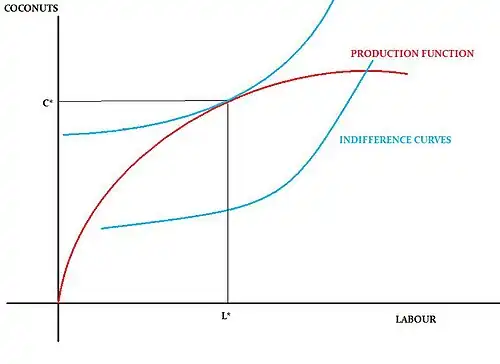 Crusoe's indifference curves depict his preferences for leisure and coconuts while the production function depicts the technological relationship between how much he works and how many coconuts he gathers. If the axes depicting coconut collection and leisure are reversed and plotted with Crusoe's indifference map and production function,[1] figure 2 can be drawn: