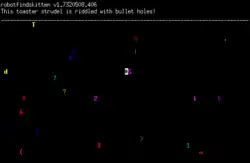 robotfindskitten is a free video game with an ASCII interface in which the user (playing the eponymous robot and represented by a number sign "#") must find kitten (represented by a random character) on a field of other random characters. Walking up to items allows robot to identify them as either kitten, or any of a variety of "Non-kitten Items" (NKIs) with whimsical, strange or simply random text descriptions. It is not possible to lose (though there is a patch that adds a 1 in 10 probability of the NKI killing robot). Simon Carless has characterized robotfindskitten as "less a game and more a way of life ... It's fun to wander around until you find a kitten, at which point you feel happy and can start again".[2]