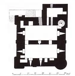 Keeps were traditionally built with an entrance at first-floor level, and Rochester's follows this pattern.[81] A forebuilding attached to the north side guarded the entrance. A stone staircase began on the west side of the keep before turning and meeting the forebuilding, which could be entered by crossing a drawbridge across a gap 9 feet (2.7 m) wide. There was another entrance in the west of the forebuilding, and at some point a new doorway was knocked through to the keep at the bottom of the drawbridge pit. The original door from the forebuilding into the keep was protected by a portcullis.[79]