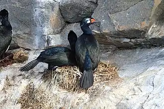 The rock shag usually nests on ledges on steep, bare, rocky cliffs. It normally lays three eggs, though nests of from two to five eggs have been seen. Nesting colonies range is size from five pairs to nearly 400.
