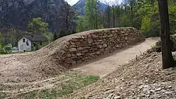 Rockfall protection embankments belong to the family of passive rockfall protection structures, comprising flexible barriers or galleries in particular.[2] They are intended for rockfalls with kinetic energies up to tens of megajoules and are preferred over flexible barriers when the design impact is higher than 5000 kJ.[3] Their declared advantages over other passive rockfall mitigation structures are low maintenance costs and reduced visual impact. Nevertheless, they are not appropriate on steep slopes and their construction generally requires extensive space and accessibility for heavy vehicles.