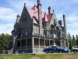 In the late Victorian period additional grand homes were constructed along Belcher Avenue, as Rockland Avenue was then known, including Duvals, constructed in 1862 and occupied by Joseph Needham, then Chief Justice of the Colony of Vancouver Island and later of Trinidad, before being sold to Francis Jones Barnard who operated a freighting company and stage coach line to the Cariboo and was later a member of the House of Commons of Canada (his son Francis Stillman Barnard was later Lieutenant-Governor).[2] Gonzales, the home of Joseph Pemberton, was built in 1885 near the corner of Rockland and St. Charles Street.[3] Fairholme, the home of John Chapman Davie and his wife Sara Holmes Todd, was built in 1886 on Rockland Hill.[4] Gyppeswyk, built in 1889 for the Greens who, like many of Rockland's early residents, relocated from the once fashionable James Bay neighbourhood to take up residence in Rockland, served briefly as the residence of the Lieutenant Governor of British Columbia after a fire destroyed Cary Castle. Located on Moss Street, Gyppeswyk forms today the nucleus of the Greater Victoria Art Gallery. Another home built in 1889 was The Laurels, which was later used as a boys' school, the gymnasium of which continues in use as the Langham Court Theatre.[5] Further along Rockland Avenue stands the Rattenbury-designed residence built in 1900 for Lyman Duff, who became Chief Justice of Canada and his wife Elizabeth.