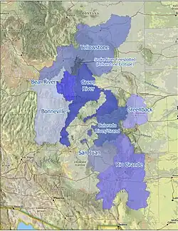 | Bear River | O. v. ssp. | Native to the Bear River watershed at the Idaho, Utah, and Wyoming border. The Bear River cutthroat were lumped with the Bonneville cutthroat as a single subspecies until recently.[6][7] Genetic studies show they are actually more closely related to the Yellowstone cutthroat than to the Bonneville cutthroat.[8][33][34] Geological evidence suggests that the Bear River flowed into the Snake River until about 500,000 years ago, when volcanic activity redirected the river south into its own basin and formed ancient Lake Thatcher.[35] The connection to the Bonneville Basin likely occurred around 20,000 years ago when Lake Thatcher overflowed into ancient Lake Bonneville.[36] Genetic evidence indicates a distinctiveness from Bonneville cutthroat, and is recognized as a distinct subspecies[3] | ![]() |