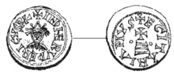 After the coup, the division of the kingdom into two factions, with the southwest (the provinces of Lusitania and western Carthaginiensis around the capital Toledo) in Roderic's hands and the northeast (Tarraconensis and Narbonensis) in the hands of Achila is confirmed by archaeological and numismatic evidence. Roderic's twelve surviving coins, all bearing the name Rvdericvs, were minted at Toledo, probably his capital, and "Egitania", probably Idanha-a-Velha.[12] The regions in which the coins have been discovered do not overlap and it seems highly probable that the two rulers ruled in opposition from different regions. It is unknown to whom the provinces of Gallaecia and Baetica fell.[12] That Roderic and Achila never appear to have come into military conflict is probably best explained by the preoccupation of Roderic with Arab raids and not to a formal division of the kingdom.[13]