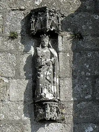 For the south porch of the Saint-Yves church in Plounéour-Ménez, Doré executed two statues of John the Evangelist and Saint Thomas. He also worked on part of the calvary with back-to-back statues of the Virgin Mary and Saint Peter and John the Evangelist and Saint Paul.[21] The atelier also worked on the Kersimonet cross executing a statue of the Virgin Mary with child.[22] Finally in Plounéour-Ménez, the Dorė atelier are credited with execution of a calvary at the "manoir du Penhoat". On the fountain there Saint Francis of Assisi and Saint James the Greater's statues are all that remain of a calvary.[1]