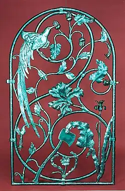 Some of his major works included a driveway gate for Yoko Ono, a firescreen for Bette Midler, firescreens for Blythe Danner and Bruce Paltrow, and a table for Eagles guitarist Don Felder.[1] His "Paradise Gate", an intricate garden gate commissioned by Australian fantasy writer Sara Douglass, is installed in her garden in Tasmania.[1] His liturgical wrought iron pieces are in several churches up and down the East Coast of the United States.[1]