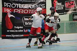 By November 2011, the league had 83 skaters, and had created the first men's roller derby team in France.[4] The men's team, the Quad Guards, travelled to London to play Southern Discomfort, in what that team described as "the first international men's roller derby game in the UK".[5] In May 2012, it played the first men's roller derby bout in France, against The Inhuman League from Sheffield in England.[6]