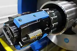 Roller burnishing is a surface finishing technique where hardened rollers cold work surface imperfections to reduce surface roughness. Roller burnishing differs from abrasive surface finishing techniques in that material is displaced rather than removed. The tooling typically consists of a hardened sphere or cylindrical roller.[1] The tooling is pressed into the surface of the part while it is rotated (in some applications, the tools are rotated instead of the part). The burnishing tool rolls against the surface of the part at a constant speed, producing a very consistent finish across the part. A surface finish of less than Ra 0.1 μm is achievable with roller burnishing.[1] A side effect is that the outer surface of the part is work hardened.