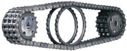If the chain is not being used for a high wear application (for instance if it is just transmitting motion from a hand-operated lever to a control shaft on a machine, or a sliding door on an oven), then one of the simpler types of chain may still be used. Conversely, where extra strength but the smooth drive of a smaller pitch is required, the chain may be "siamesed"; instead of just two rows of plates on the outer sides of the chain, there may be three ("duplex"), four ("triplex"), or more rows of plates running parallel, with bushings and rollers between each adjacent pair, and the same number of rows of teeth running in parallel on the sprockets to match. Timing chains on automotive engines, for example, typically have multiple rows of plates called strands.