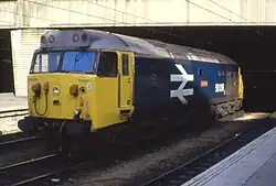 'Ramillies' | BR Co-Co Class 50 | British Rail Large logo Blue | Undergoing overhaul | The class were built for working passenger services on the West Coast Main Line (WCML) north of Crewe, to Preston, Lancaster, Carlisle and Glasgow Central, with the locomotive being originally allocated the running number D419. The locomotive was named after HMS Ramillies on 18 April 1978. In 1984 Ramillies was repainted in a variation of BR Blue by staff at Plymouth Laira depot. 50019 had visited East Anglia prior to preservation, being stabled at March depot in January 1987.[17] Withdrawn for overhaul in 2013.[18] |