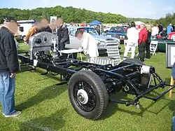 The chassis of the Phantom II was completely new. The front axle was mounted on semi-elliptical leaf springs as on earlier 40/50 hp models, but the rear axle was now also mounted on semi-elliptical springs instead of cantilever springs. This, along with the drivetrain changes, allowed the frame to be lower than before, improving the handling.[1][3] The 4-wheel servo-assisted brakes from the Phantom I were continued, and the Bijur centralized lubrication system from the Springfield-built Phantom I was included on all Phantom II chassis.[1]