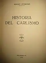 The work which earned Oyarzun name in the Spanish historiography is his History of Carlism. Though historiographic and especially political literature on Carlism had already been massive, the only precedent work attempting an overall history of the movement was Historia de la guerra civil y de los partidos liberal y carlista by Antonio Pirala Criado. The study was first published in 1858 and prolonged systematically in following editions, the last one of 1906 covering the period up to the 1870s; it is usually considered a high-quality,[117] fairly non-partisan account.[118] Oyarzun's proposal, originally to be titled Compendio de Historia del Carlismo,[119] immediately replaced outdated Pirala's work as the first reference book on history of Carlism, the position it would occupy itself for the next half of a century. Once completed the author did not re-edit the work for further releases; except minor changes, the 1939 and the 1969 versions almost do not differ.[120]
