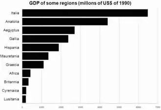 Angus Maddison is the only economist cited who offers a detailed breakdown of the national disposable income (NDI) of the various parts of the Roman Empire. His "highly provisional" estimate (see right) relies on a low-count of the Roman population of only 44 million at the time of the death of Augustus in 14 AD. Italia is considered to have been the richest region, due to tax transfers from the provinces and the concentration of elite income in the heartland; its NDI per capita is estimated at having been between 40%[68] and 66%[69] higher than in the rest of the empire. Besides Italy, the wealthiest province was Egypt, in terms of NDI per capita.[81]