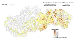 According to the last census from 2021, there were 67,179 persons counted as Romani people in Slovakia (Slovak: Rómovia na Slovensku), or 1.23% of the population.[1] However, the number of Roma is usually underreported, with estimates placing the Roma population at 7–11% of the population. Thus the actual number of Roma may be over half a million.[2]