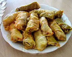 - Sarmale - stuffed sour cabbage or grape leaves with ground meat with rice, onions, herbs. It is boiled for a few hours traditionally in ceramic pots. In Transylvania smoked pig feet or pork skins are placed in the pot between the stuffed cabbages. There are also many vegan varieties stuffed with rice and herbs.