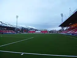 TIL played an exhibition match against Germany's 1. FC Nürnberg on 22 July 1987, but chose to play it at Valhall instead of Alfheim to spare the pitch.[7] The opening match took place against England's Queens Park Rangers on 27 July 1987, with TIL losing 0–1 in front of 2,700 spectators.[8] On 26 August Norway's Olympic football team played 0–0 against Switzerland in front of 4,000 spectators.[9] Tromsø played St Mirren on 30 September 1987 in the 1987–88 European Cup Winners' Cup, which became the northernmost location of a European football match.[10] The teams tied 0–0 and Tromsø did not advance.[11] The municipality had to save the stadium company from bankruptcy through a private placement in 1992, thus becoming a majority shareholder.[4] In a 2012 survey carried out by the Norwegian Players' Association among away-team captains, Alfheim was ranked seventh amongst league stadiums, with a score of 3.60 on a scale from one to five.[12]