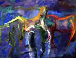 Ronan Walsh's work retains a tension between abstraction and figuration that recalls the work of Jack B. Yeats in moments like 'The Singing Horseman' and abstract expressionists like Willem de Kooning. There is the same vigorous, thickly applied paint and scenes where subjective expression overrides careful or conservative rendering of the subject.[8]