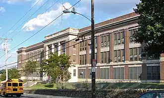 This building was designed by Irwin T. Catharine and built between 1922 and 1924. It is a three-story, seventeen-bay, brick building that sits on a raised basement. Created in the Colonial Revival style, it features a central projecting entrance pavilion of brick and stone, with stone pilasters, and a stone cornice and brick parapet.[2] The school was named for President Theodore Roosevelt.