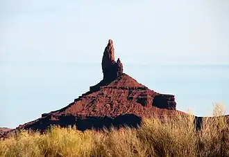 Rooster Rock is situated 8.25 miles (13.28 km) southeast of the Monument Valley visitor center on Navajo Nation land. Precipitation runoff from this butte's slopes drains into Gypsum Creek, which is a tributary of the San Juan River. Topographic relief is significant, as the summit rises nearly 900 feet (274 meters) above the surrounding terrain in 0.25 mile (0.4 km). The nearest higher neighbor is Meridian Butte, 1.06 miles (1.71 km) to the south-southwest.[2] The landform's descriptive toponym has been officially adopted by the U.S. Board on Geographic Names.[3]