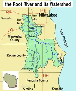 The Root River is a 43.7-mile-long (70.3 km)[1] river that flows to Lake Michigan at the city of Racine in southeastern Wisconsin in the United States. Racine and Racine County are named for the river, as racine is the French word for root.