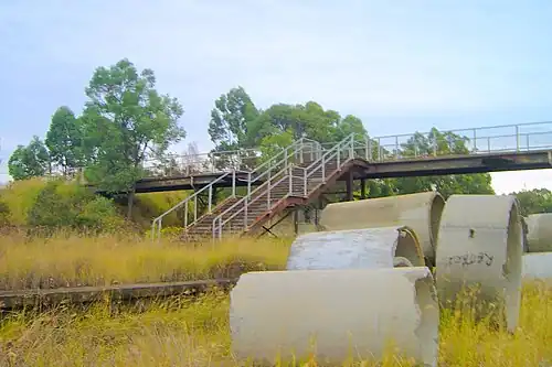The Ropes Creek line was named after a nearby creek bearing the same name. It was built during World War II to transport munitions factory workers to and from St Marys.[1] The line opened from St Marys to Dunheved on 1 March 1942 and Dunheved to Ropes Creek on 29 June 1942.[2] When electrification arrived in the 1950s, there was a plan to electrify the Ropes Creek line. For the most part all the sidings in the Dunheved station area were electrified to enable the New South Wales Government Railways (NSWGR) to use electric locomotives of the 46 class to shunt trains without the need to change to diesel-electric or diesel-hydraulic locomotives.