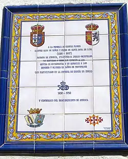 Plaque in Baños de Montemayor, Spain dedicated to Gaspar Flores, the father of Rose of Lima.