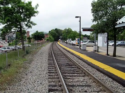 Roslindale Village station is an MBTA Commuter Rail station on the Needham Line, located in the Roslindale Square business district of the Roslindale neighborhood in Boston, Massachusetts. The station has a single side platform serving the line's single track, with a mini-high platform for accessibility.