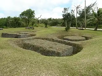 A latte stone pillar (also called a taga stone)[2] is a two-piece structure consisting of a base (haligi) and hemispherical cap (tasa), with the flat side turned upwards. It is believed that the prehistoric latte stone pillars were used as housing foundations for the indigenous culture of the Marianas. The homes sat on top of two parallel rows of the pillars, and the Chamorro, or their ancestors, buried their dead between the rows.[3] The stones pre-date any retained oral history of the Chamorro, who cite the original source of the stones as the "taotaomona" (before time people). The exact age of the stones has not been determined, but some are believed to date back to at least 845 AD. Carbon dating places the indigenous population as far back as 3,000 BC.[4]