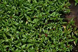 The stems are many branched, creeping and rooting below. Leaves are narrow, sessile, oppositely arranged alternately at right angles, microscopically truncate at apex. The flowers and fruits are solitary, sessile and crimson color.[1][3][4]