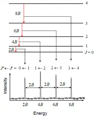 The diagram illustrates rotational transitions that obey the =1 selection rule. The dashed lines show how these transitions map onto features that can be observed experimentally. Adjacent transitions are separated by 2B in the observed spectrum. Frequency or wavenumber units can also be used for the x axis of this plot.