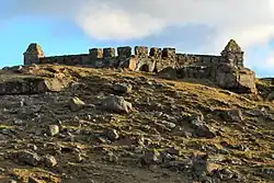 Rothley Crags (55°11′33″N 1°56′06″W / 55.1926°N 1.9349°W), a wild tract of country which was once Sir William Blackett's deer-park. With the mania our ancestors had for ruins, and surely there were enough in Northumberland already without building them, Sir William had some most realistic castellated ruins built on the top of the crags![4]