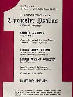 On 6 June 1966, Wales conducted the first London performance of Leonard Bernstein's Chichester Psalms with the London Academic Orchestra, London Student Chorale and Pro Arte Singers in the Duke's Hall of the Royal Academy of Music. Bernstein's work also featured in the official opening concert of the University of Warwick Arts Centre in October 1974, in the presence of the Composer, who was the recipient of an Honorary Doctorate from the university.